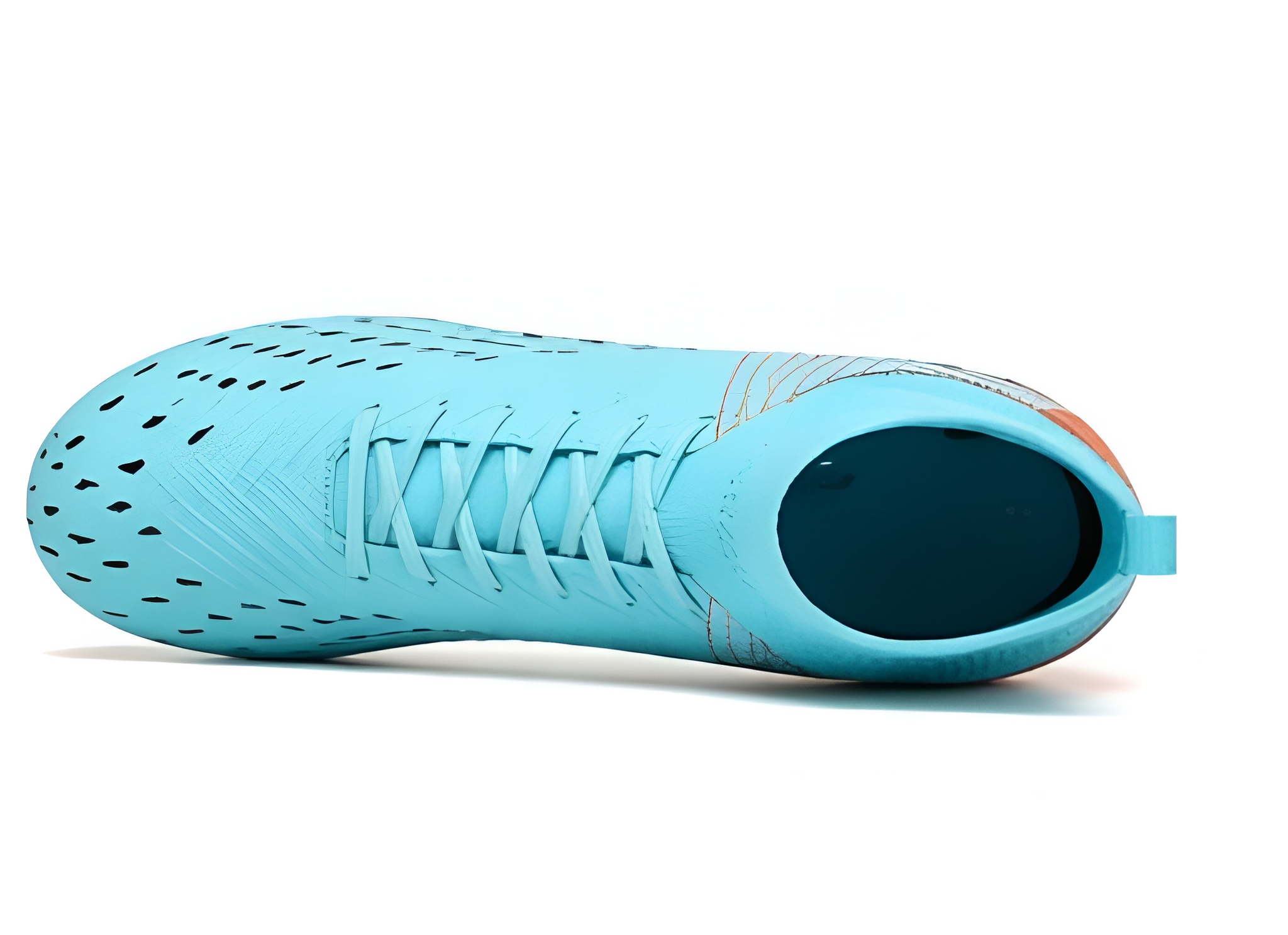 Nowoczesne buty piłkarskie typu FG (Firm Ground) z elastycznym kołnierzem zapewniają maksymalną kontrolę, dopasowanie i stabilizację podczas gry na naturalnej trawie. Model w kolorze jasnoniebieskim z pomarańczowymi akcentami łączy dynamiczny design z funkcjonalnością dla wymagających zawodników.