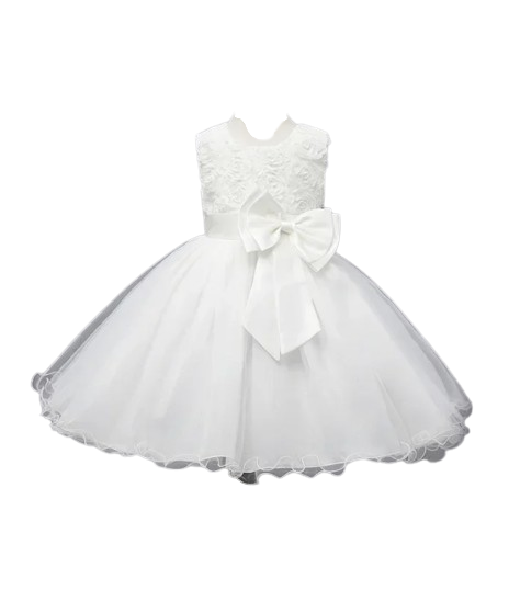 Sukienka dla dziewczynki w kolorze białym, ozdobiona eleganckim wiązaniem w pasie. Wykonana z lekkiego i miękkiego materiału, który zapewnia komfort noszenia dla malucha. Sukienka ma prosty fason, ale dzięki dodatkowemu zdobieniu w postaci wiązania w pasie nabiera eleganckiego charakteru. Doskonale sprawdzi się na specjalne okazje, takie jak uroczystości rodzinne czy imprezy świąteczne.